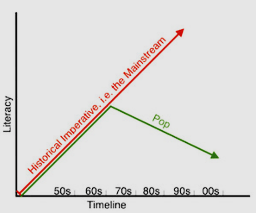 Mainstream sei nämlich, der „Historical Imperative, der bis Mitte der 1960er Jahre auch „Pop“ hätte sein können, aber danach habe „Pop“ seine „literacy“ verloren. Diese bestehe nämlich in der „ability, facility and will to pursue an accurate portrayal of the human condition with sound“.